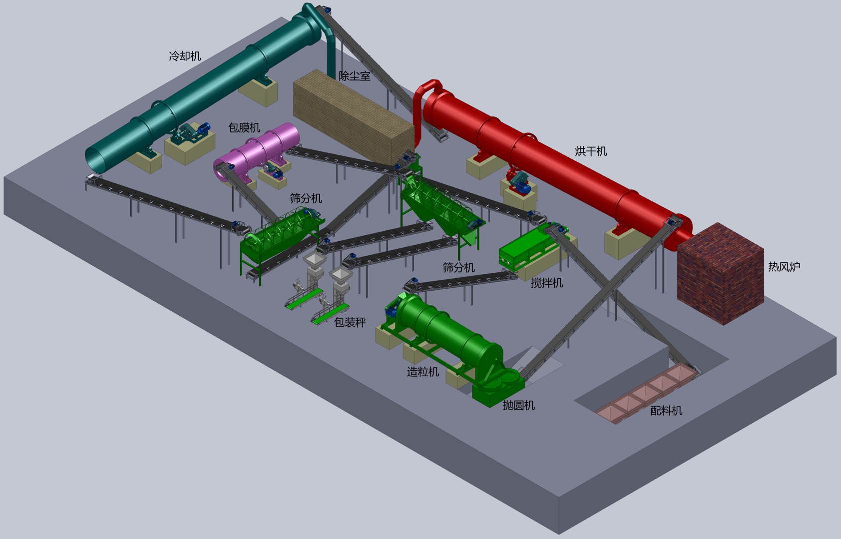 烘干后的顆粒再通過(guò)輸送帶抵達(dá)冷卻筒進(jìn)行冷卻.